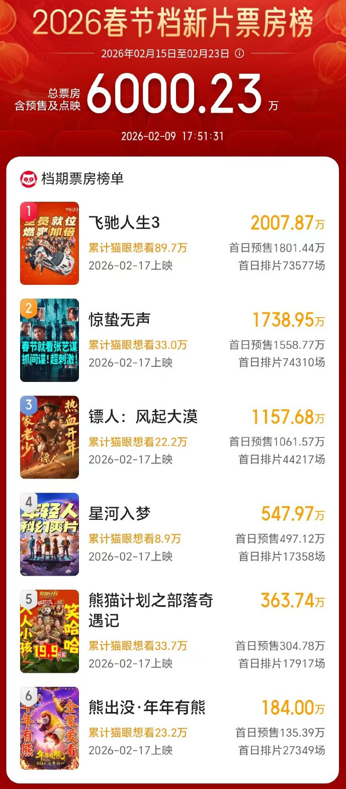 2026春节档新片预售票房破6000万