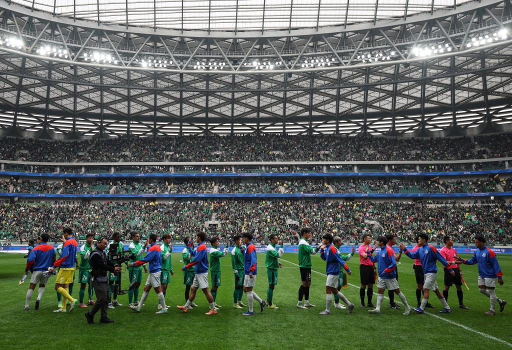 3月21日,在北京举行的2026赛季中国足球协会超级联赛第三轮比赛中,北京国安与上海申花的球员在赛前相互致意。新华社记者 胡星宇 摄