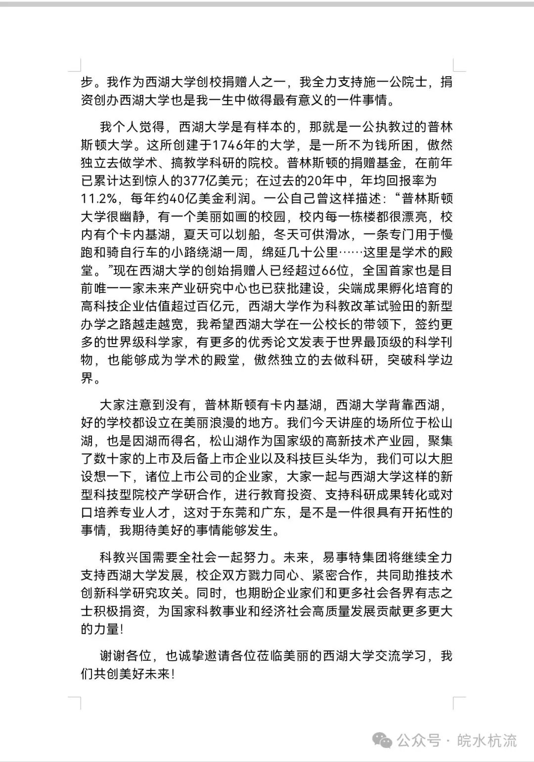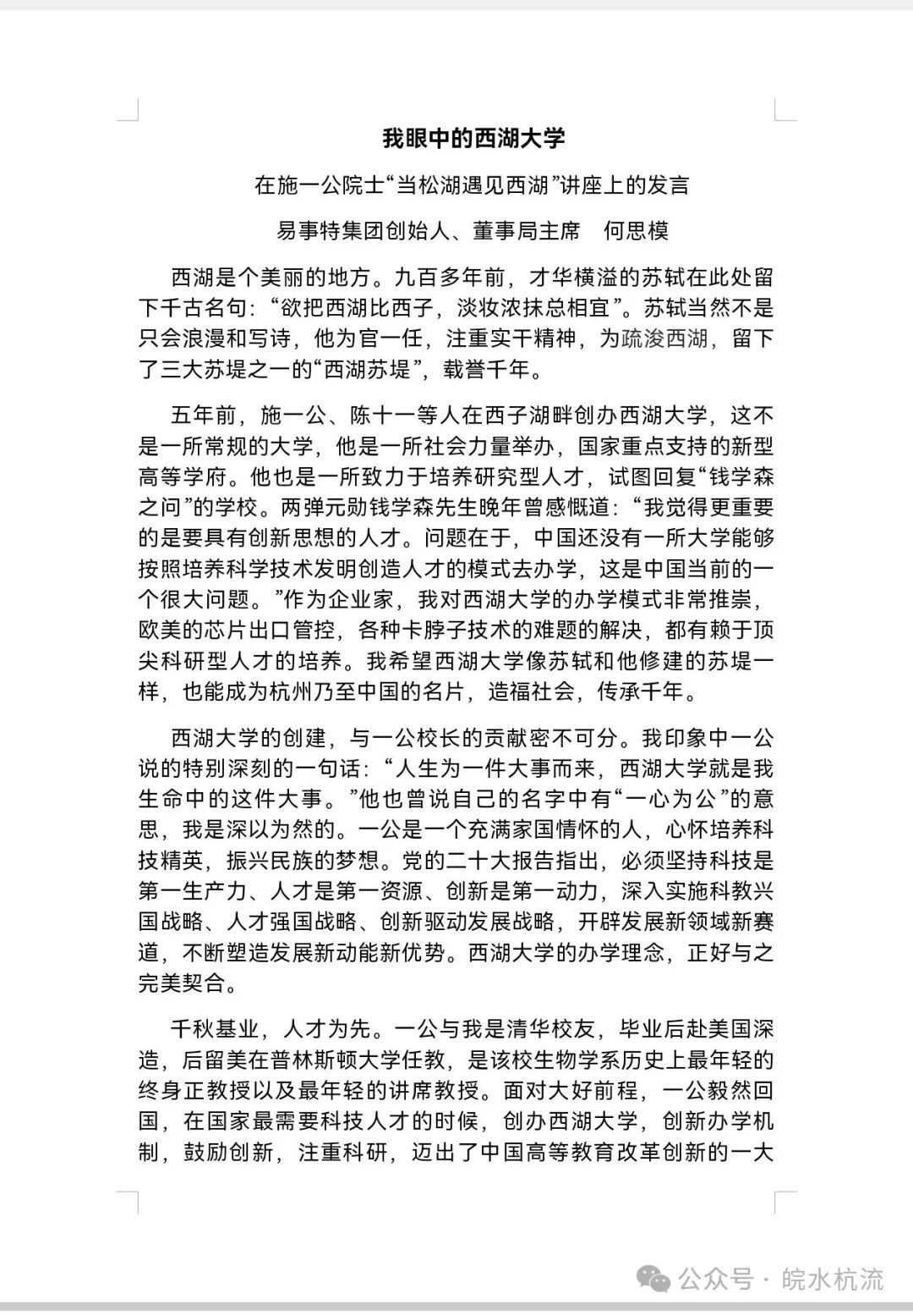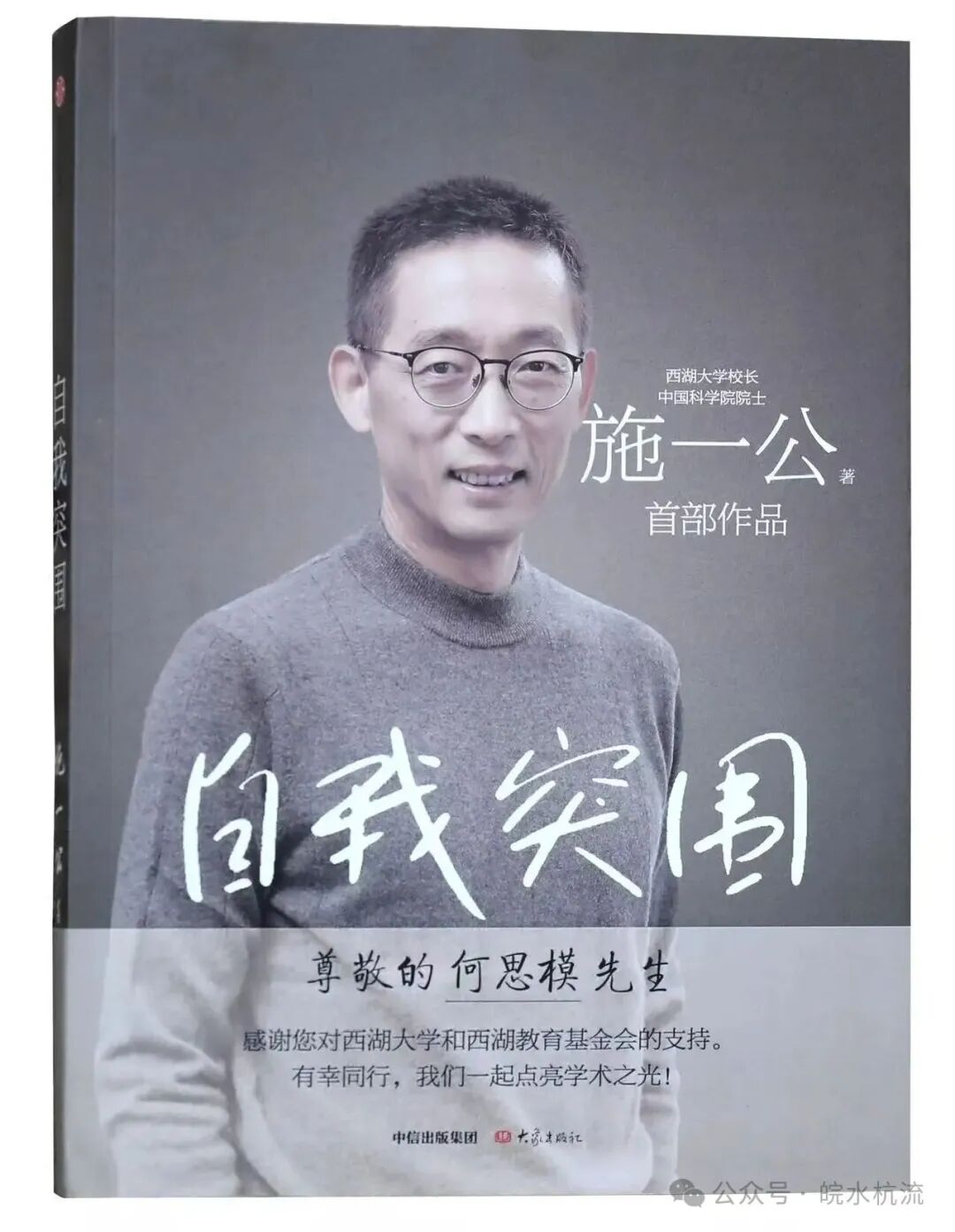清晨的光漫过窗棂,我刚把一篇关于何思模先生的文章发布到个人公众号,手机屏幕骤然亮起——系统提示:新关注者“何思模”。几句寒暄后,他发来一份西湖大学演讲稿PDF、施一公所著《自我突围》腰封题签的照片等资料。隔着屏幕,我能触摸到一位宿松老乡的温度——他不做云端“神仙企业家”,而是把根扎在泥土里的乡贤,把心系在长江边的故乡。